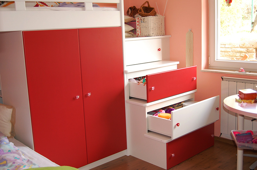 A nagyméretű szekrény, és a lépcső alól kihúzható fiókok elrejtik az összes játékot és ruhát anyuka nagy örömére :)
