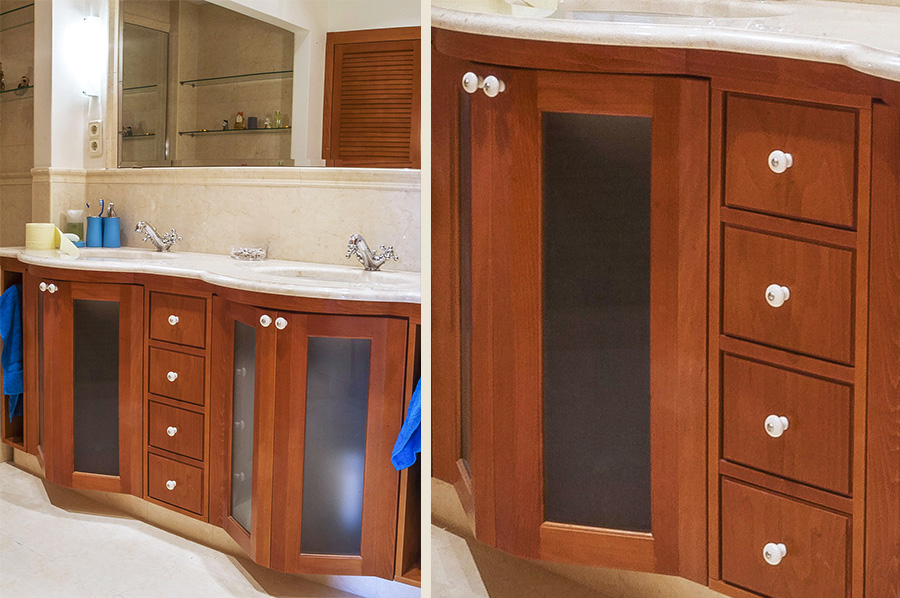 Bükkfából készített fürdőszoba szekrény öreg cseresznyére pácolva