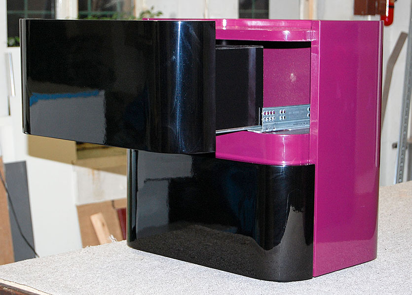 ...míg a szekrényke külső elemei magasfényű festéssel és polírozással készült