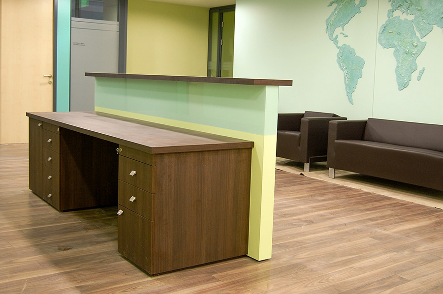 A recepció átadó pultja formára vágott és színezett üveggel díszített