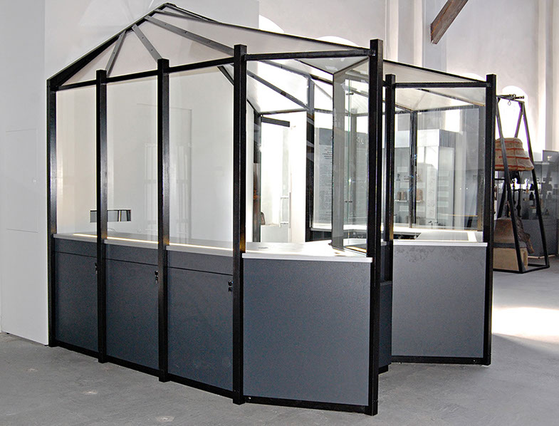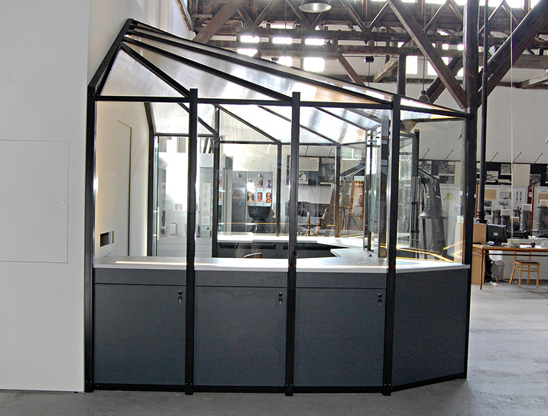 Ganz Ábrahám öntödei múzeum recepciós pultja, a szellemiségnek megfelelően természetesen vas vázszerkezettel