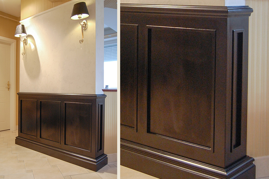 Térelválasztó fal bőr borítással és ívre hajlított tölgyfával