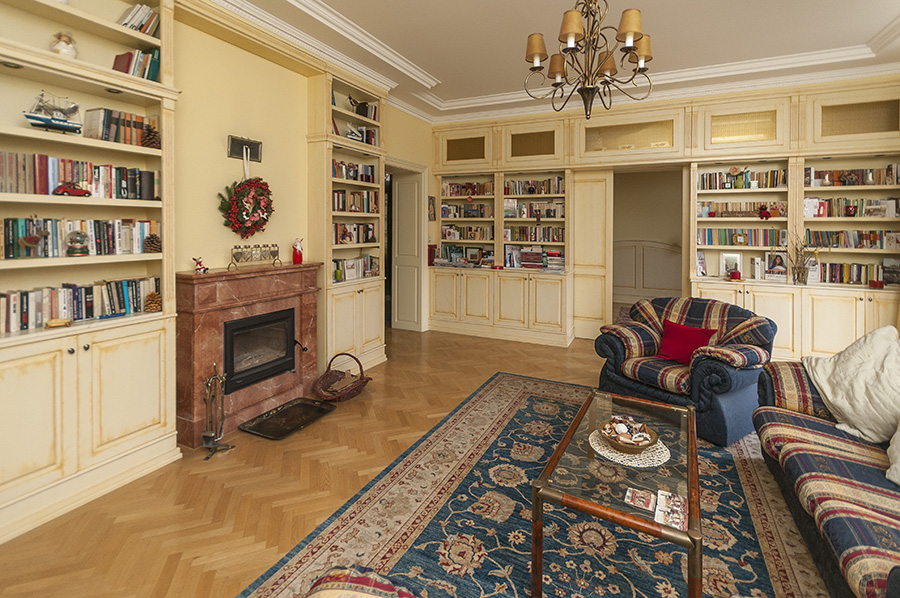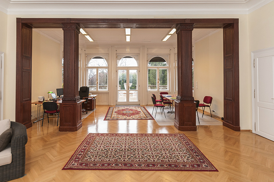 Rezidencia fogadó termének oszlop burkolata faragott és esztergált díszítő elemekkel, tölgyfából