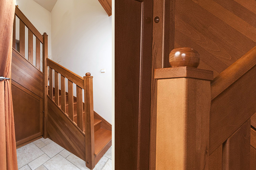 Bükkfából készített lépcsőlapok és korlát cseresznye színre pácolva-lakkozva