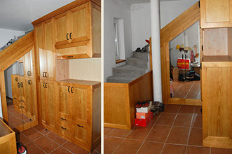 Magánlakásba épített előszoba szekrény lucfenyőből, olajozott felületkezeléssel