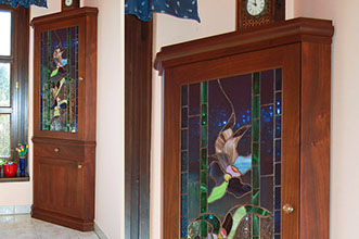Sarokszekrény diófából, tiffany stílusú üvegbetéttel