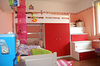 A nagyméretű szekrény, és a lépcső alól kihúzható fiókok elrejtik az összes játékot és ruhát anyuka nagy örömére :)