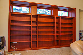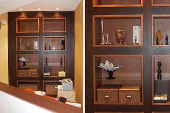 Nagyméretű falfülke beépítése a meglévő meranti ablakok színére pácolva