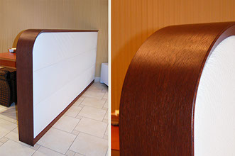 Térelválasztó fal bőr borítással és ívre hajlított tölgyfával