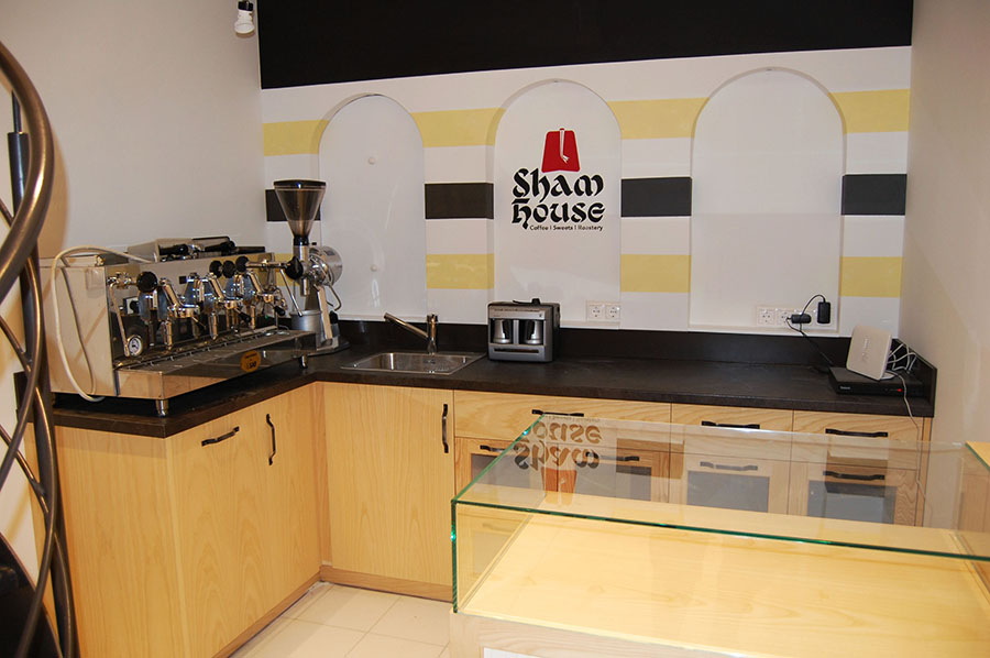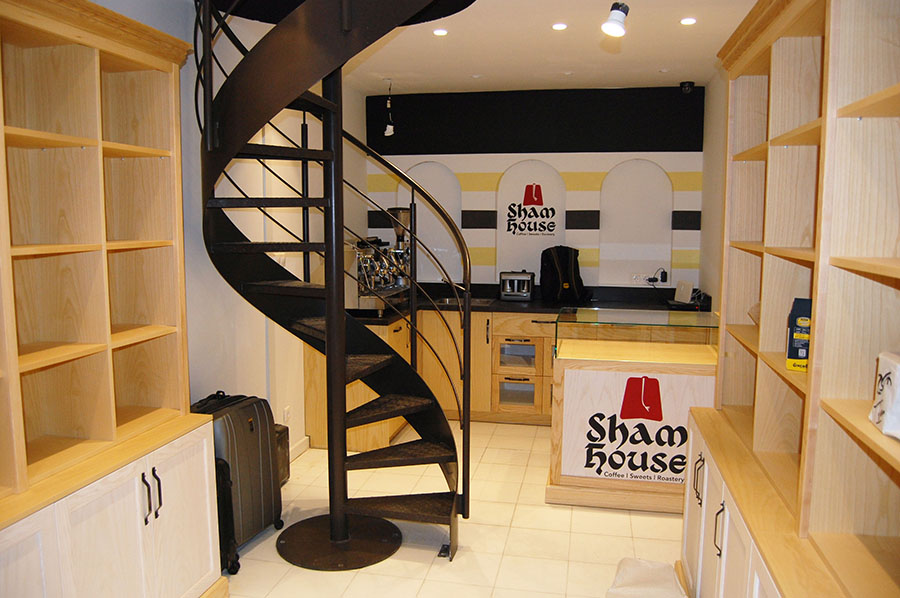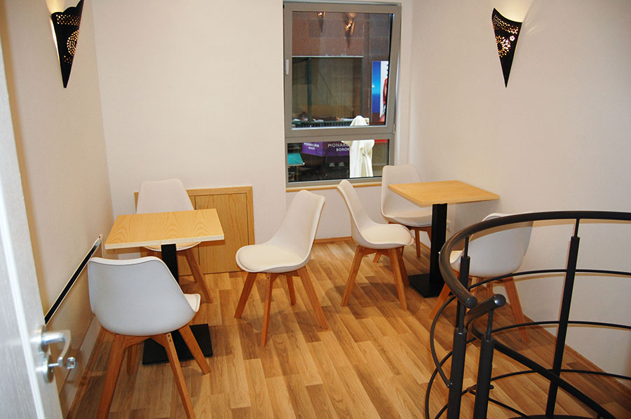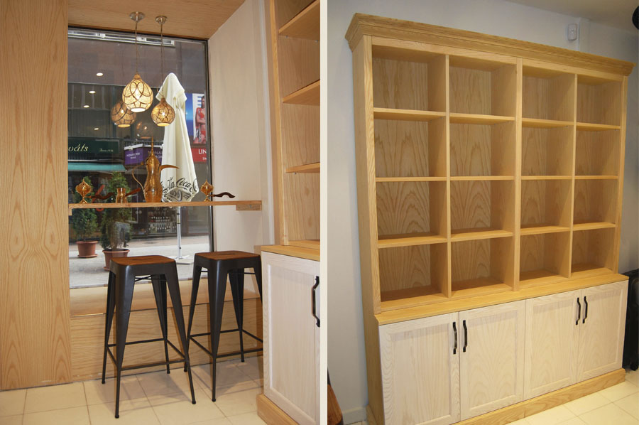 Haris köz-Váci utca sarkán lévő kávé és édesség bolt berendezése kőrisfából, natúr matt felületkezeléssel.