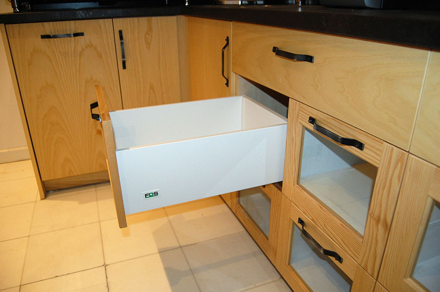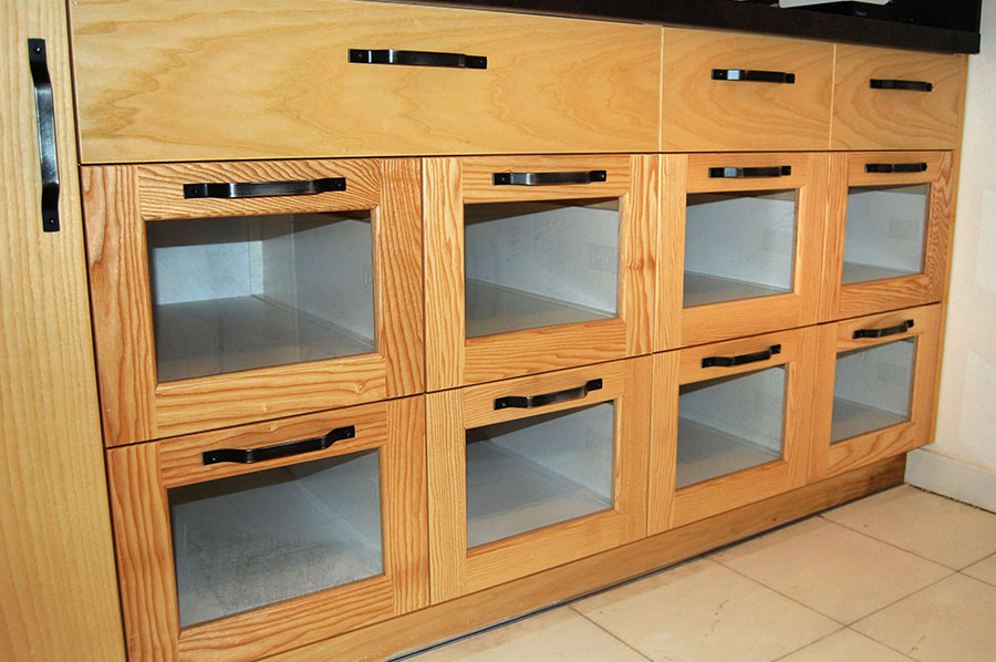 JTI teakonyhája laminált bútorlapból és alumínium keretes felső üvegajtókkal