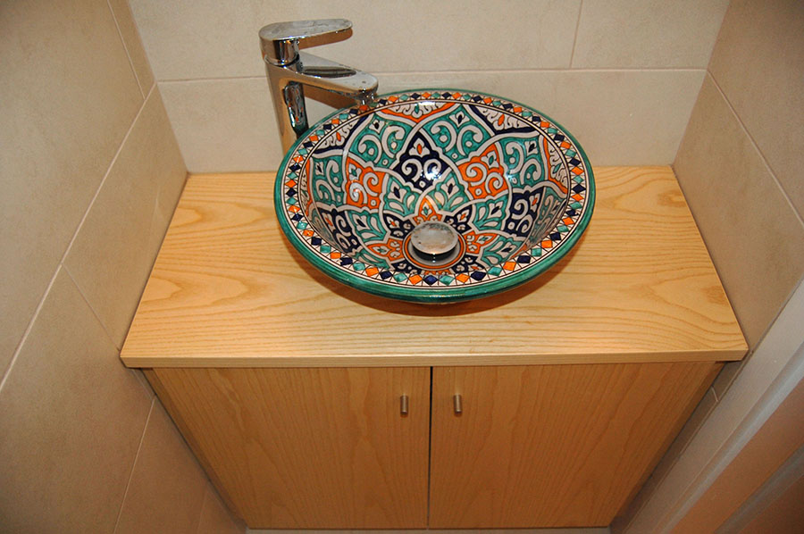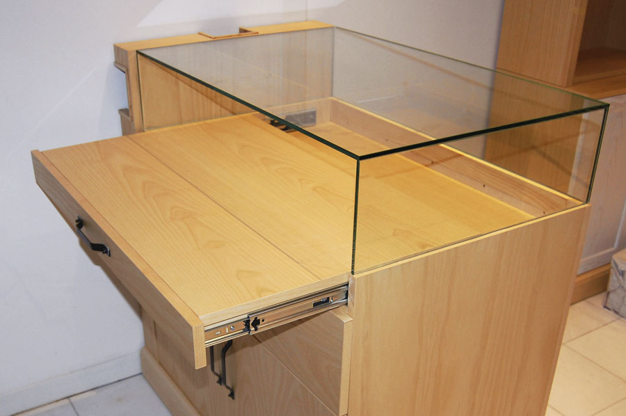 A recepció átadó pultja formára vágott és színezett üveggel díszített